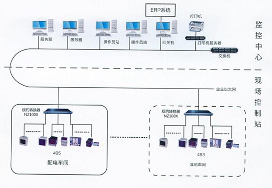根據車間設備較多,分布比較分散的特點,配電車間電量采集選用NZ194E完成一回線全電量采集,如電流、電壓等。其他監控模塊選用NZ194I/O,采集直流模擬量如車速、溫度、流量等數據,實現對車間生產設備的全面監測。同時通過RS485總線把數據集中到串口服務器NZ100X上,集中后經以太網把數據送往監控中心,由NZ800P配電電動化系統軟件處理。